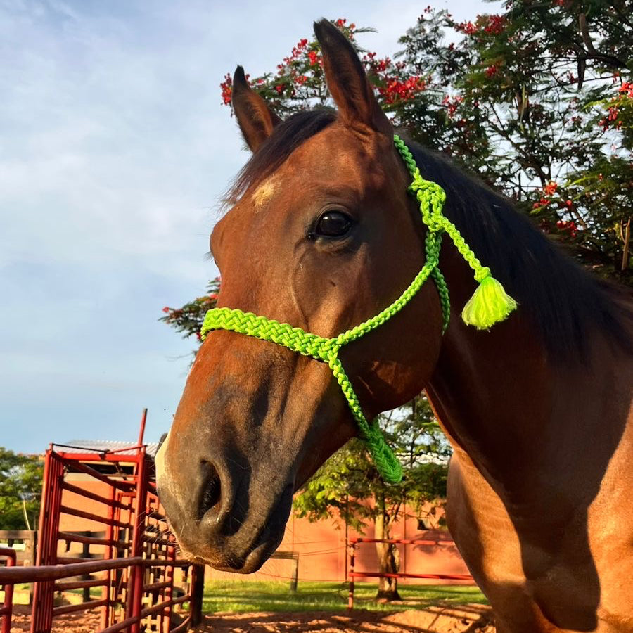 Cabresto trançado artesanal, feito à mão com corda naval de polipropileno verde limao — resistente, bonito e funcional para o dia a dia ou provas.